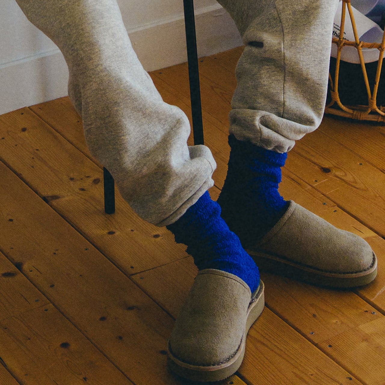 ざっくりとした生地感を出すため、意匠撚糸のカール糸を使用してローゲージで編み上げたソックスです。表面はまるでプードルのようにカールしており、見た目にも楽しいデザイン。
