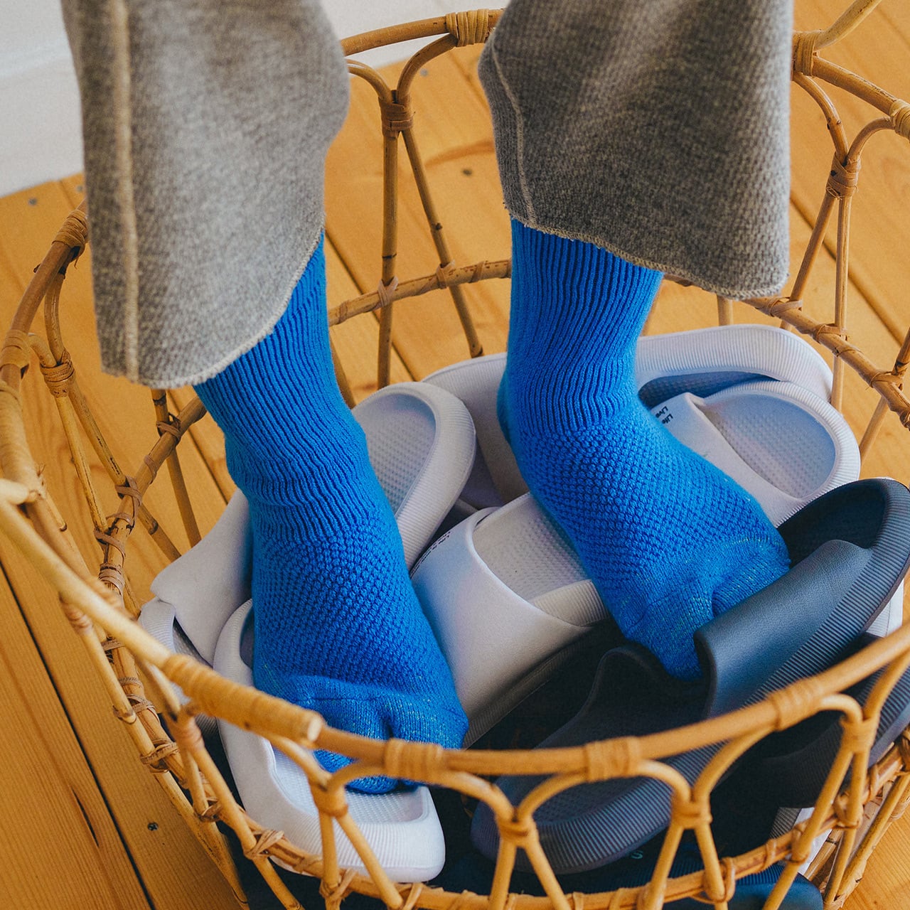 つま先は無縫製で快適フィット、甲部分はメッシュ編みで通気性を確保し蒸れを防止。