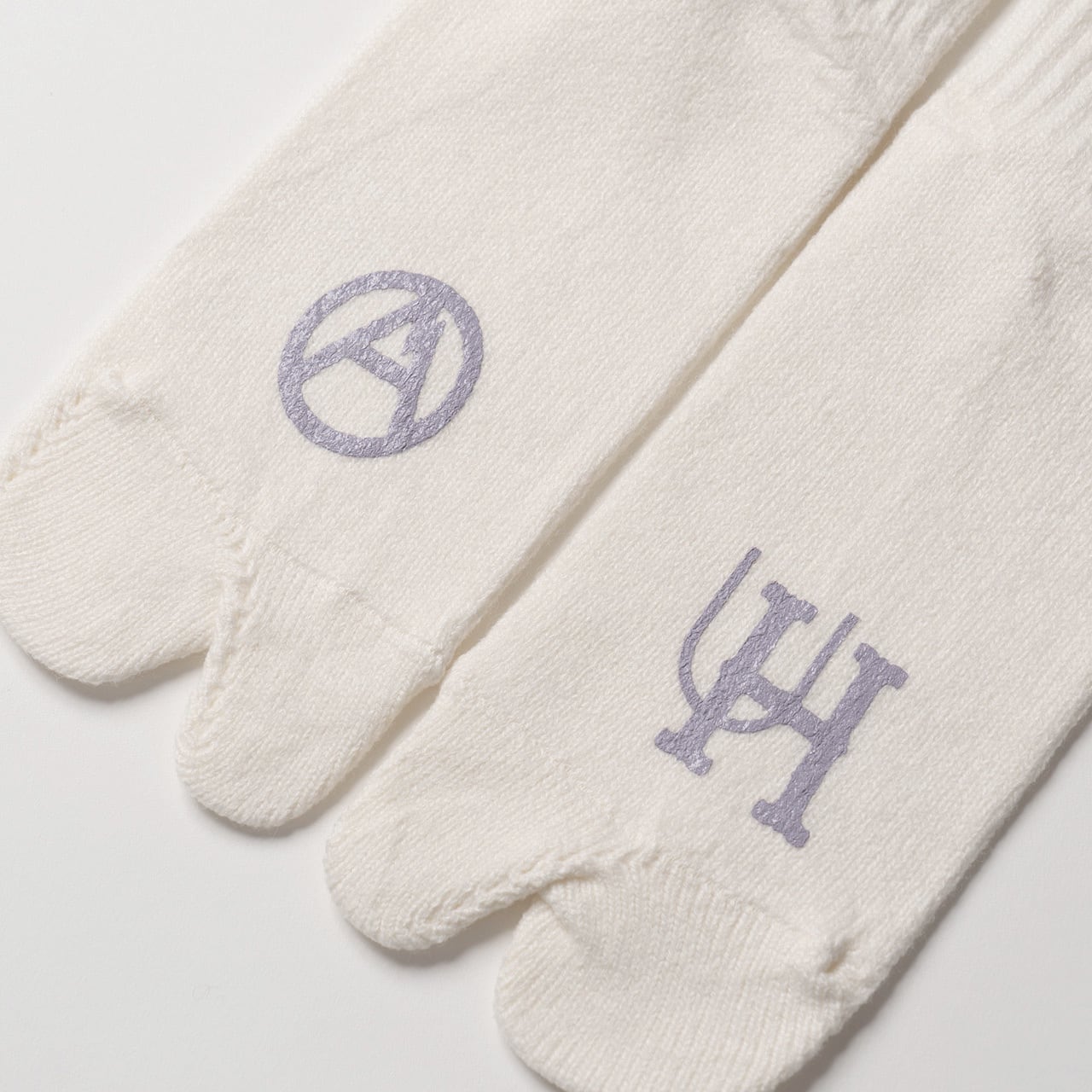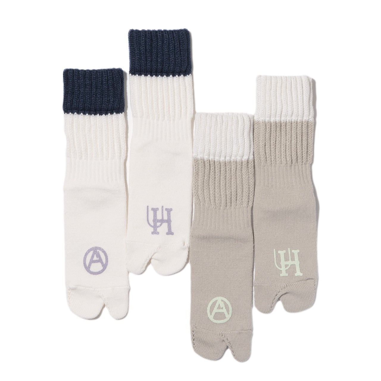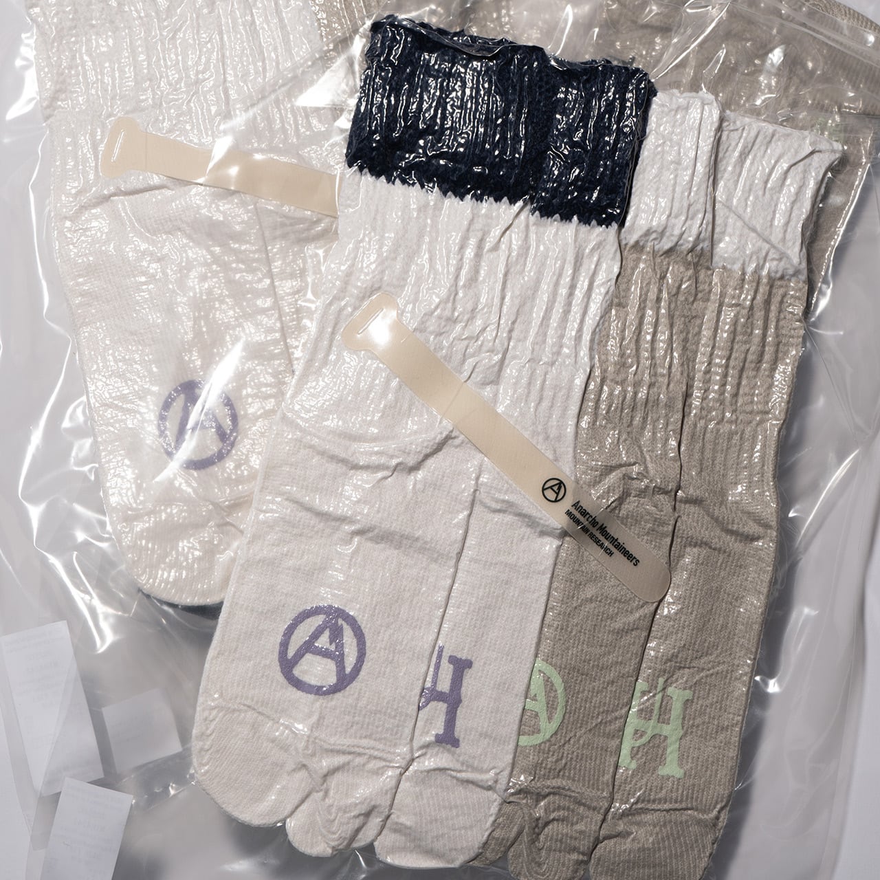 《ULTRA HEAVY》と《NODAL》のコラボレーションアイテムに、さらに《Mountain Research》による別注のかかった特別な一足です。ルームソックス用の編み機でゆったりと編み立てられており、リラックス感のある履き心地が魅力です。足首にはサポートゴムを入れ、適度なフィット感もプラス。左足の《ULTRA HEAVY》はそのままに、右足には“A”マークを添えた、別注ならではの仕上がり。プリントのカラーはNODALオンライン限定色です。2色1セット、真空パックでお届けいたします。