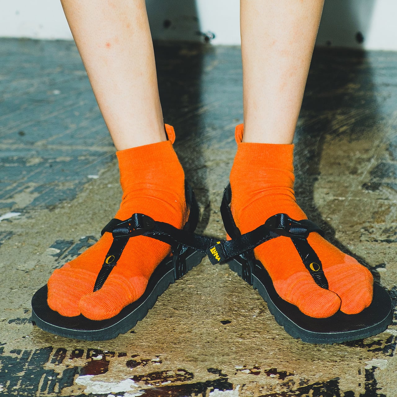 つま先とかかとには左右非対称のパイル編みを施し、